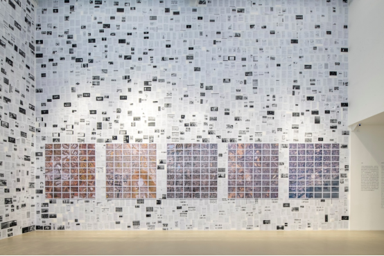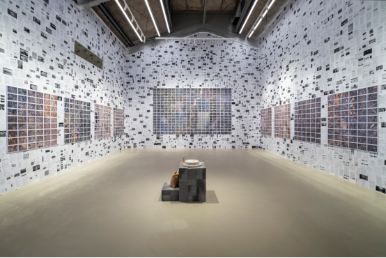 核心作品《即使它看起来像草》占据了整个中央展厅,艺术家利用谷歌地球卫星图像呈现了两组卫星图像,在一面展墙上呈现了包括从法国中央-卢瓦尔河谷大区的斜方形田地,到美国北达科他州佩姆比纳县的大块笔直的方田,再到印度北方邦阿扎姆加尔县的细碎小块田地等六个国家小麦产地的地形地貌。从地球上高度机械化与大规模农场经营模式到传统的农耕方式,作品呈现了不同国家的农业模式与社会结构的深入思考。